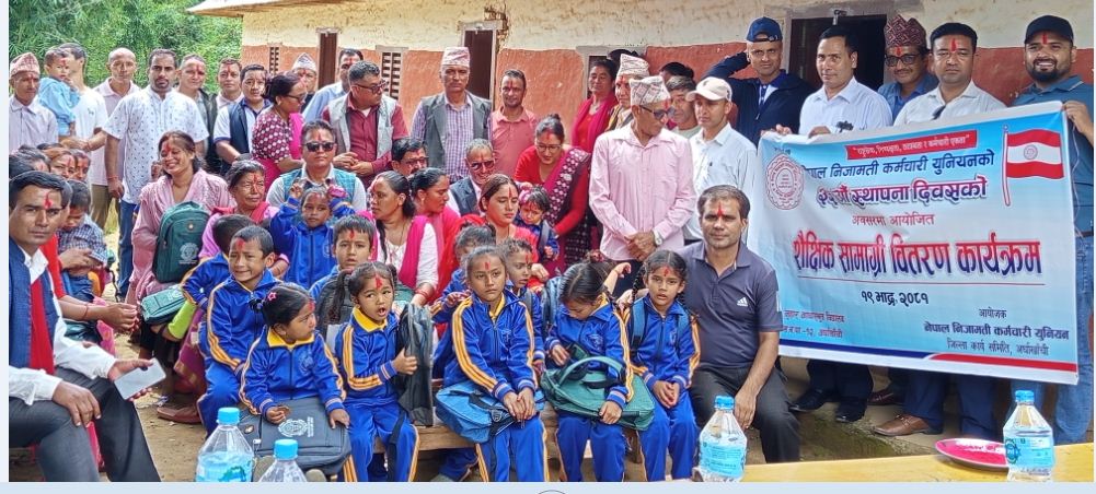 नेपाल निजामती कर्मचारी युनियनको ३५ औं स्थापना दिवसको अवसरमा जिल्ला कार्य समिती अर्घाखाँचीले विद्यार्थीलाई शैक्षिक सामाग्री वितरण गरेर स्थापना दिवस मनाएको छ ।जसअन्तर्गत सन्धिखर्क नगरपालिका वडा नम्बर १२ मा रहेको