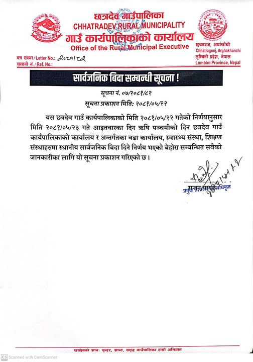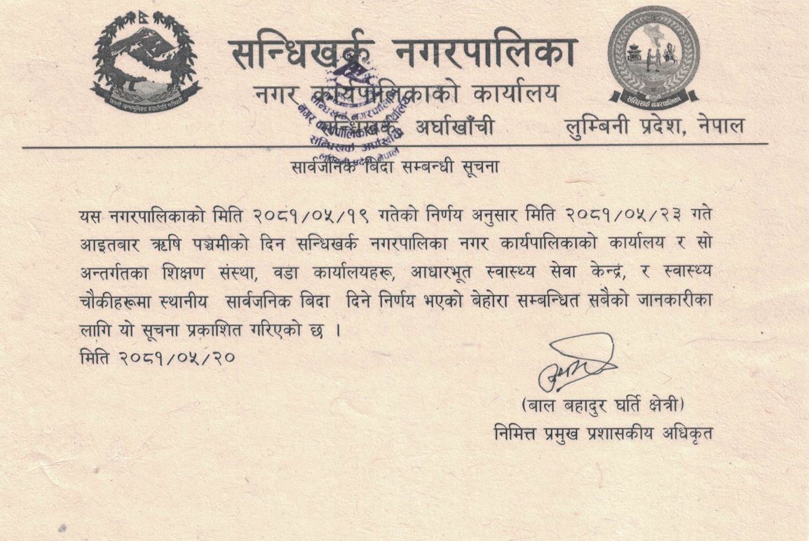सन्धिखर्क ।ऋषिपञ्चमी पर्व आज नेपाली नारीहरूले अरुन्धतीसहित सप्त ऋषिको पूजा आराधना गरी मनाउँदैछन् ।सोहि अवसरमा अर्घाखाँचीका तिन वटा स्थानीय तहले आज सार्वजनिक बिदा दिएका छन। जसअन्तर्गत सन्धिखर्क नगरपालिका,पाणिनी गाउँपालिका र छत्रदेव गाउँपालिकाले सार्वजनिक बिदा दिएका हुन ।