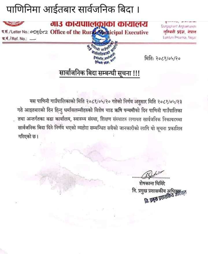 आज ऋषिपञ्चमी पर्व अर्घाखाँचीका तिन पालिकामा सार्वजननिक बिदा