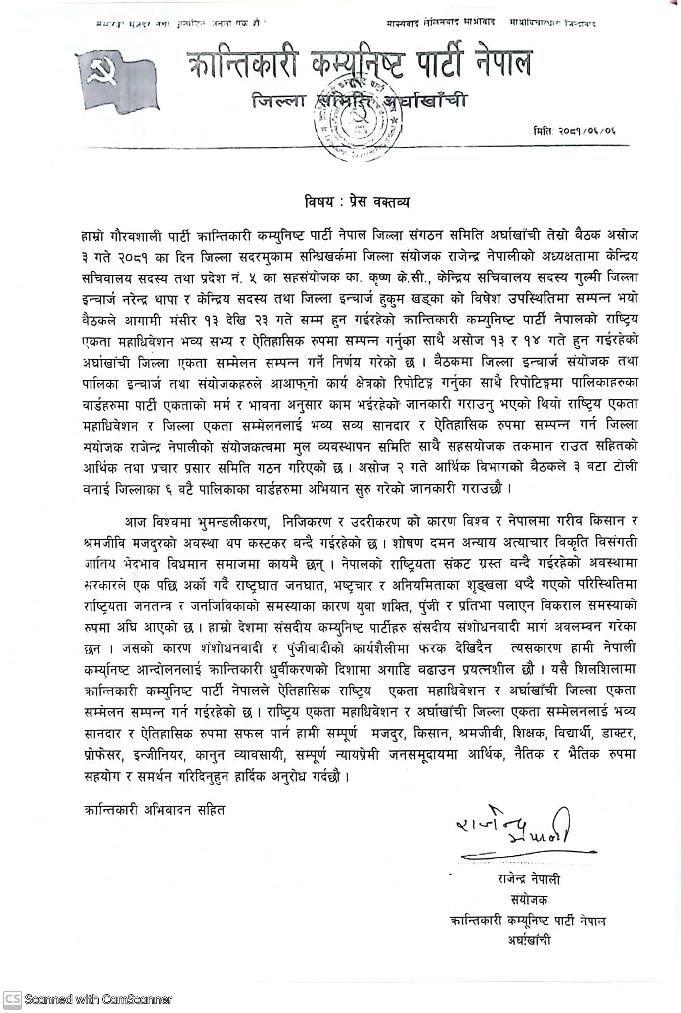 सन्धिखर्क ।क्रान्तिकारी कम्युनिष्ट पार्टीले आसन्न मङ्सिर १३ देखि २३ सम्म काठमाडौमा एकता महाधिवेशन र यहि असौज १३ र १४ गते सन्धिखर्कमा जिल्ला सम्मेलन गर्न लागेको क्रान्तिकारी कम्युनिष्ट पार्टीका अर्घाखाँची संयोजक राजेन्द्र नेपालीले जानकारी दिनुभयो ।जसको लागि अशोज २ गते आर्थिक विभागको बैठकले ३वटा टोली बनाई जिल्लाका ६ वटै पालिकाका वडाहरुमा भेला सम्पन्न गरेको सन्धिखर्कमा पत्रकार सम्मेलन गरि उक्त विषयमा जानकारी गराएको हो ।