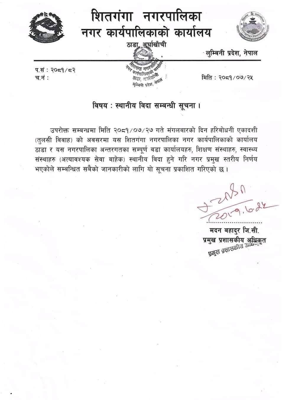 अर्घाखाँचीःशितगंगा नगरपालिकामा भोली सार्वजनिक बिदा