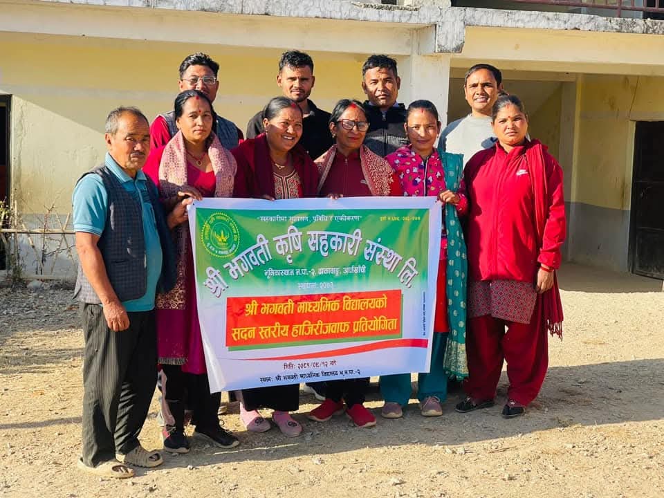भगवती कृषि सहकारी संस्था लिमिटेट भूमिकास्थान नगरपालिका वडा नम्वर २ ढाकावाङ्गकाे आयाेजनामा भगवति माध्यमिक बिद्यालय काेटमैदानमा सदन स्तरिय हाजिरिजवाफ प्रतियाेगिता सम्पन्न भएकाे छ ।