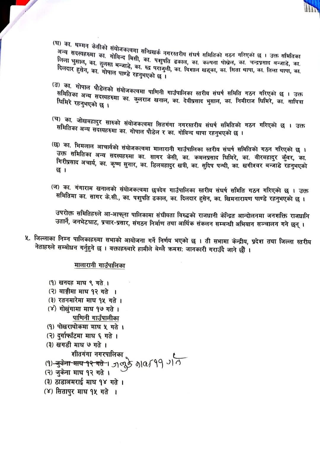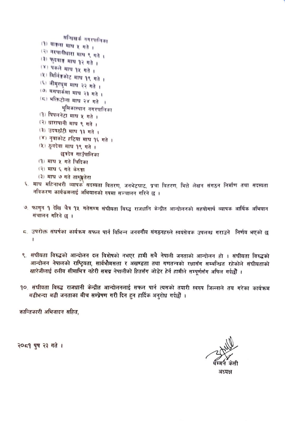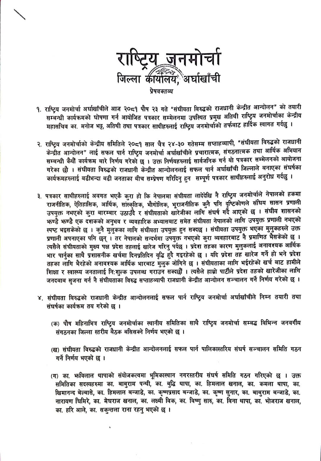 जसको पुर्व सन्ध्यामा पालिका जिल्ला तहबाट संघीयता विरुद्ध कार्यक्रमको लागि विभिन्न संघर्ष समिति बनाउने भएको छ। ती समितिमा आबद्ध पदाधिकारीलाई आन्दोलनको कार्यक्रममा सहभागी गराउने बताउनुभयो ।
