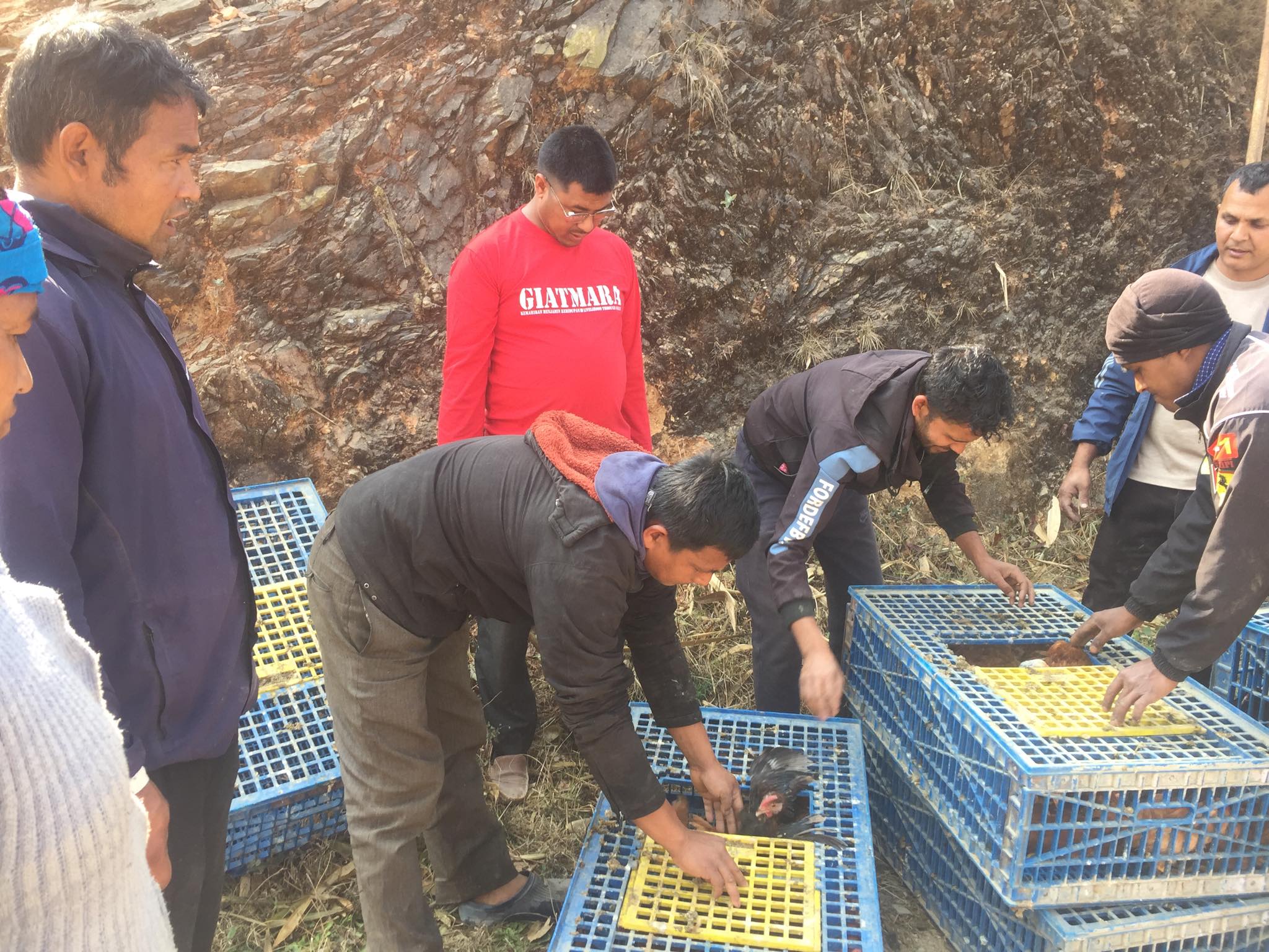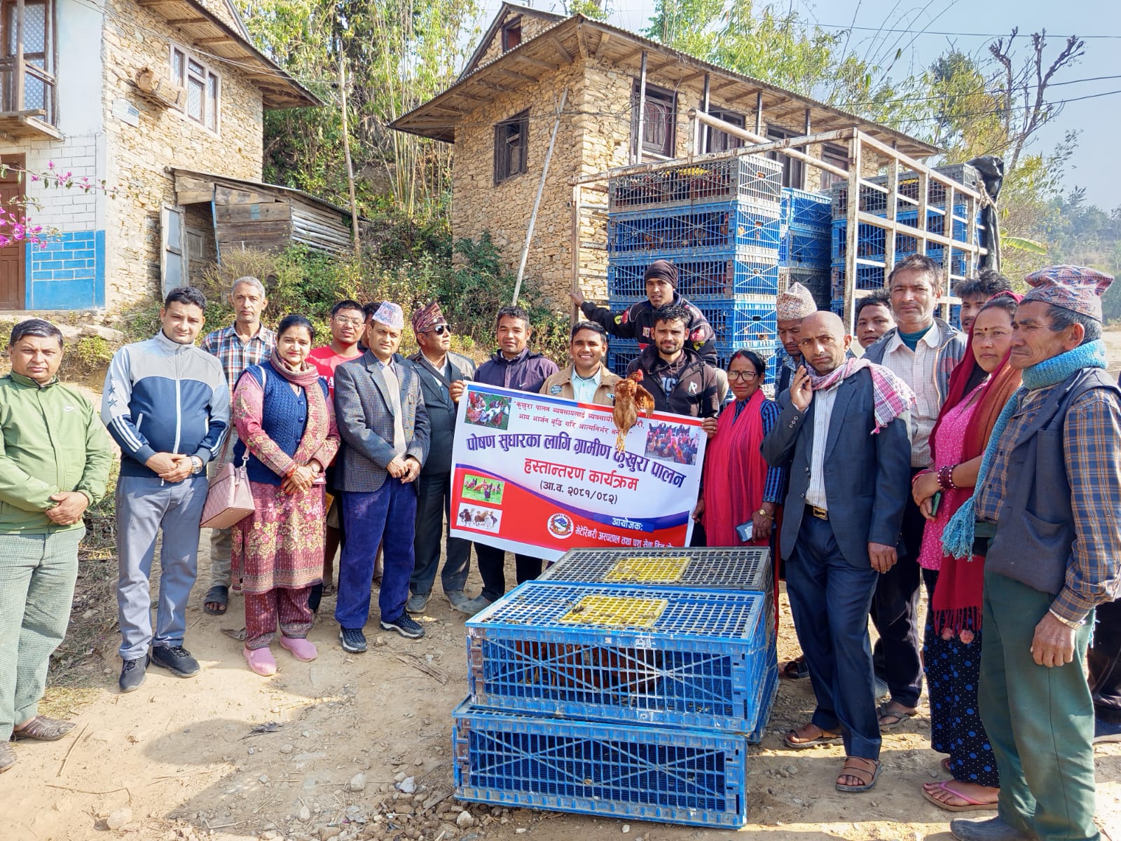 पहिलो चरणमा भगवती कृषि सहकारी संस्था मार्फत १२ सय ५० स्थानीय जातका ९हप्ताका कुखुरा वितरण गरिएको हो।