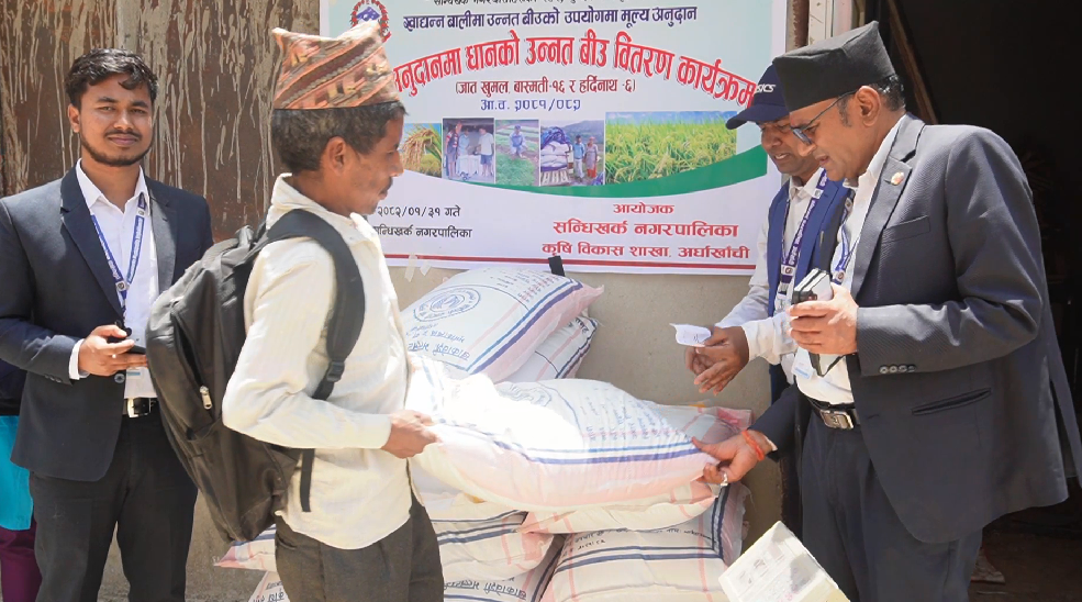 अर्घाखाँचीको सन्धिखर्क नगरपालिकाले किसानलाई अनुदानमा धानको बिउ वितरण गरेको छ ।किसानको मागको आधारमा ५० प्रतिसत अनुदानमा खुमल बास्मती १६ र हर्दिनाथ ६ नामक धानको बिउ वितरण गरिएको प्रमुख प्रशासकिय अधिकृत खिमानन्द भुसालले बताउनुभयो ।नगरपालिकाले धानको उत्पादन बढाउन टेवा पुगोस भनेर अनुदानमा बिउ वितरण गरेको हो।