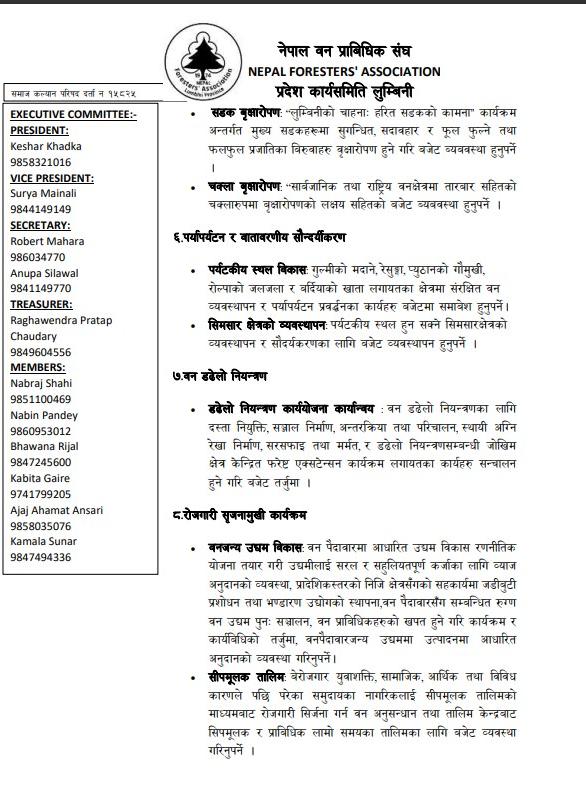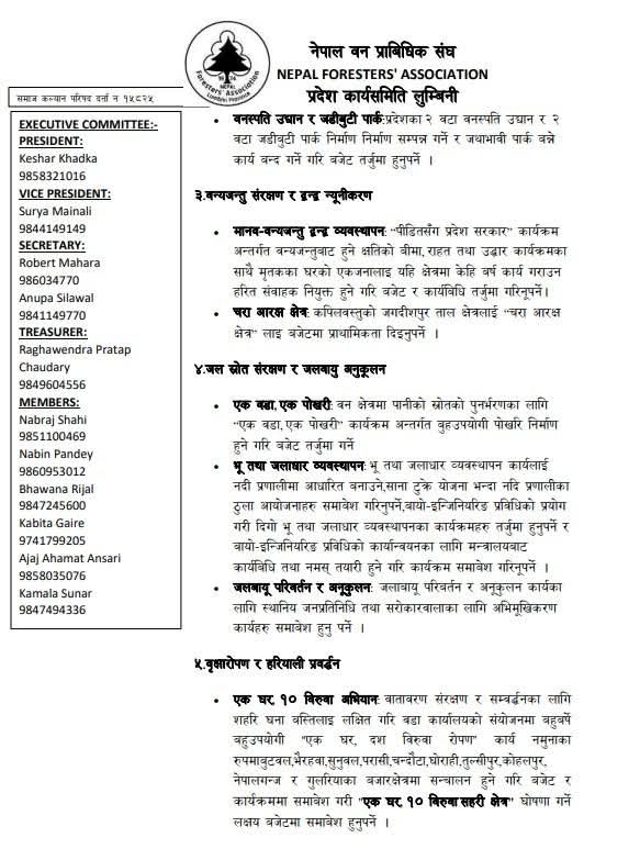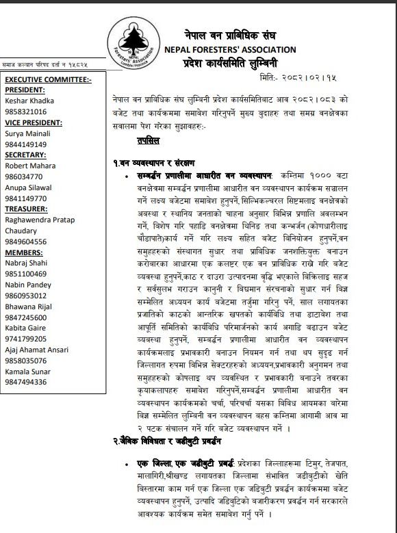 वन तथा वातावरण मन्त्री देवकरण प्रसाद कलवार (सन्तु) र सचिबलाई नेपाल वन प्राबिधिक संघ लुम्बिनी प्रदेशले आगामी बजेटका लागि विभिन्न सुझाव दिएको हो ।जसअन्तर्ग वन व्यवस्थापन र संरक्षण,जौविक विविधता र जडीबुटी प्रबद्र्घन,वन्यजन्तु संरक्षण र द्घन्द्घ न्युनिकरण,जल श्रोत संरक्षण रजलवायु अनुकुलन,वृक्षारोपण र हरियाली प्रबद्र्घन,पर्यापर्यटन र वातावरण र वातावरण सौन्दर्यीकरण,वन डढेलो नियन्त्रण र रोजगारीको सृर्जनामुखी कार्यक्रमको लागि सुझाव दिएको अध्यक्ष खड्काको भनाइ छ ।