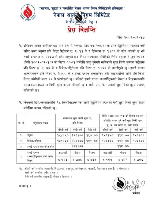 १७ जेठ, काठमाडौं । पेट्रोलियम पदार्थको मूल्य बढेको छ । नेपाल आयल निगमका अनुसार पेट्रोलमा २ र डिजेल र मट्टितेलमा भने १ रुपैयाँले मूल्य वृद्धि भएको हो ।आजै राति १२ बजेबाट लागू हुने निगमले जनाएको छ ।