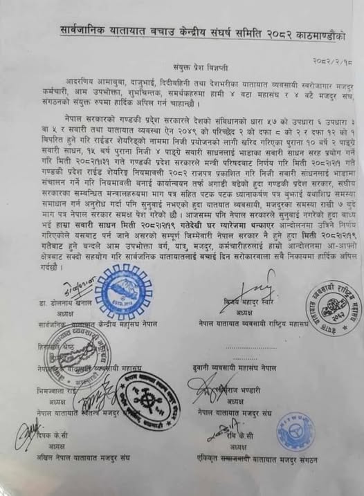 सार्वजनिक यातायात बचाउ केन्द्रीय संघर्ष समिति’को आह्वानमा देशभरका सार्वजनिक यातायात ग्यारेजमै थन्क्याएर बस्ने निर्णय भएको नेपाल यातायात स्वतन्त्र मजदुर संगठनका अध्यक्ष भीमज्वाला राईले बताएका छन ।
