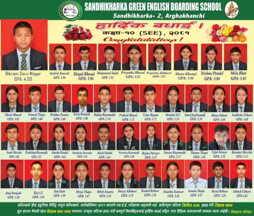 सन्धिखर्क ग्रीन इङ्गलिस बोर्डिङमा एसईईमा सहभागी ४२ जना विद्यार्थी सहभागी रहेकोमा शत प्रतिशत पास हुन सफल भएको र एक जनाले ४ जिपिए ल्याउन सफल भएका छन।यो अभियानमा सघाउने सम्पुर्णलाई प्रिन्सिपल टेकबहादुर थापाले बताउनुभयो ।