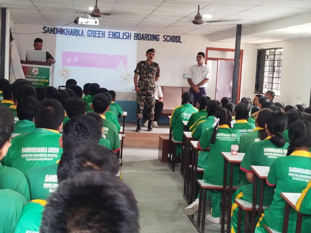 रुद्रमणि भुसाल,साउन २४ ।नेपाली सेना वीर भद्रजङ्ग गुल्म अर्घाखाँचीले विपत तयारी पूर्व अभ्यास तथा न्युनिकरण सम्बन्धी सचेतना मुलक कार्यक्रम आज सन्धिखर्क नगरपालिका वडा नम्बर २ मा रहेको सन्धिखर्क ग्रीन इङलिस बोर्डिङमा सम्पन्न गरेको छ ।
