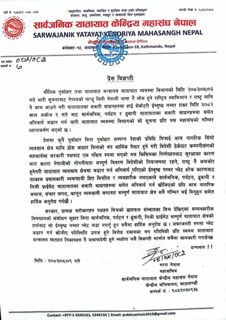 जबर्जस्ती प्लेट जडान गर्न खोजिए हुने विरोध र दबाबका गतिविधिप्रति स्वयं यातायात मन्त्रालयमातहतका निकाय नै जवाफदेही हुने महासंघले चेतावनी दिएको छ।
