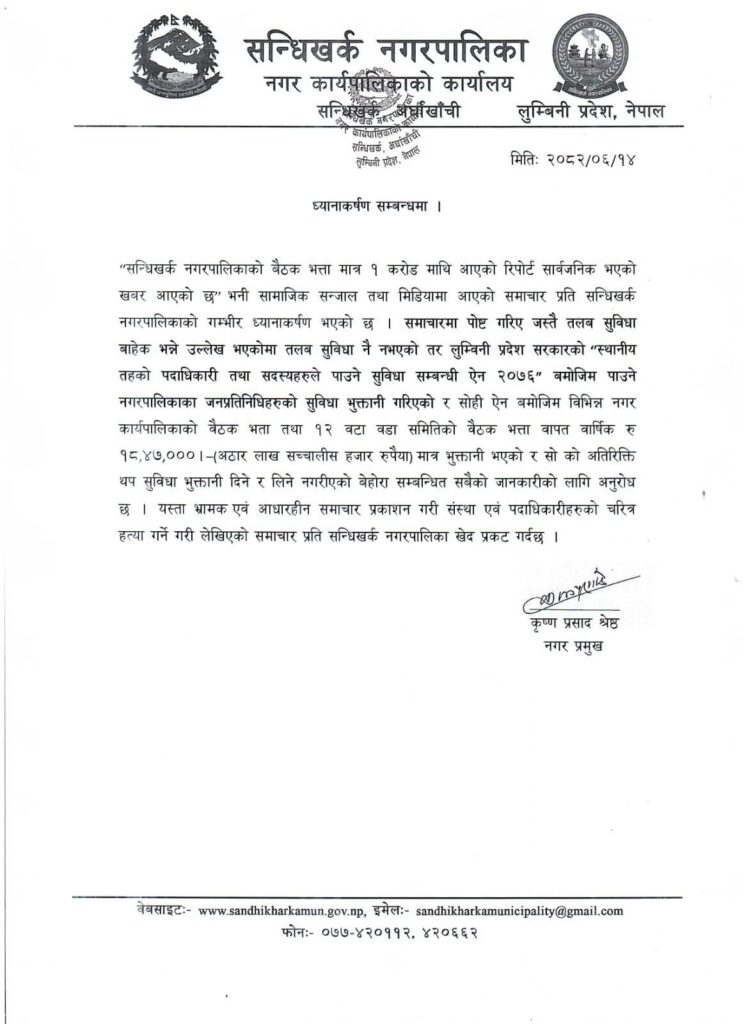 सन्धिखर्क ,असोज १५lसन्धिखर्क नगरपालिकाले १ करोड बढी भत्तामा खर्च भएको विषयमा सत्य नभएको बताएको छ ।सामाजिक संजालमा कुनै तथ्य नबुझी १ करोड बढी भत्ता बुझेको भन्ने विषय सत्य नभएको सन्धिखर्क नगरपालिका प्रमुख कृष्ण प्रसाद श्रेष्ठले निकालेको विज्ञप्तीमा उल्लेख छ ।