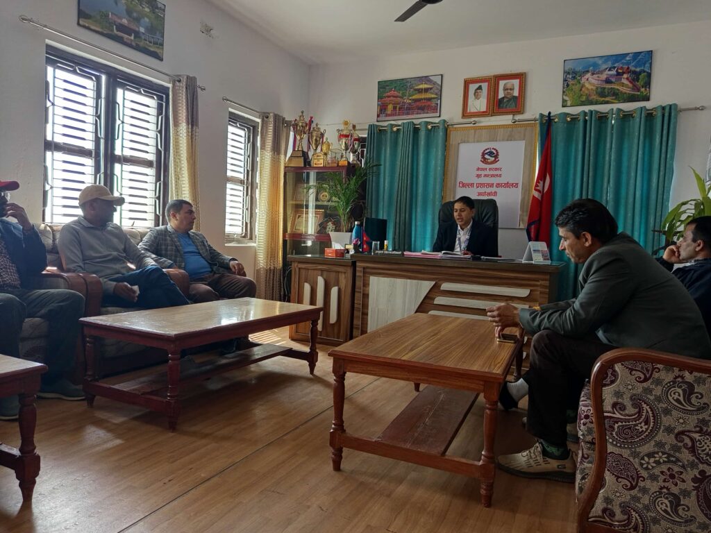 यस्तै शान्ती सुरक्षालाई मजवुद बनाउन सबै क्षेत्रबाट सहयोगको अपेक्षा रहेको बताउनुभएको हो ।प्रजिअ सुवेदीले पछिल्लो समयमा जिल्लामा देखिएका मुख्य समस्याको बारेमा पत्रकार संग जानकारी लिनुभएको थियो ।कार्यक्रममा पत्रकार महासंघ लुम्बिनी प्रदेश का कोषाध्यक्ष प्रेमनारायण आचार्य,जिल्ला अध्यक्ष गणेश खनाल,पुर्व अध्यक्ष अशोक खनाल लगायतका संचारक्रमीको सहभागीता रहेको थियो ।