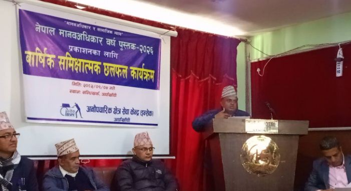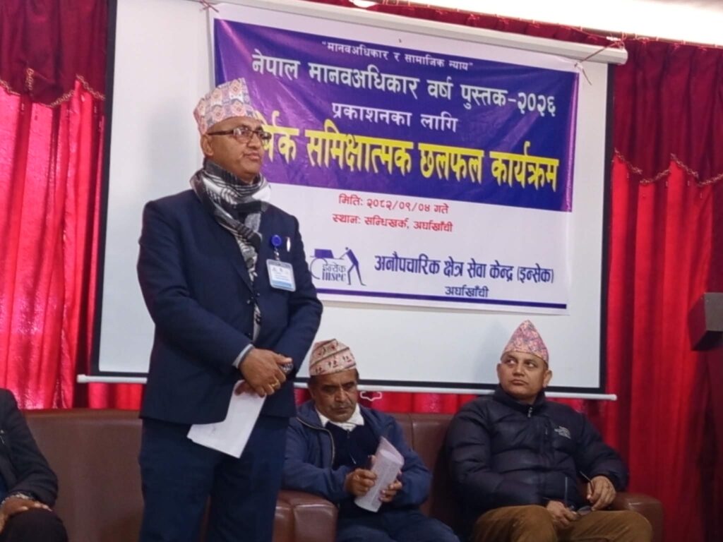 सागर महत,मंसिर ०४सन्धिखर्क ।अनौपचारिक क्षेत्र सेवा केन्द्र (इन्सेक) अर्घाखाँचीको आयोजनामा जिल्लामा मानव अधिकारको अवस्थाबारे नेपाल मानव अधिकार वर्ष पुस्तक २०२६ प्रकाशनका लागि वार्षिक समीक्षा कार्यक्रम आज सन्धिखर्कमा सम्पन्न भएको छ।
