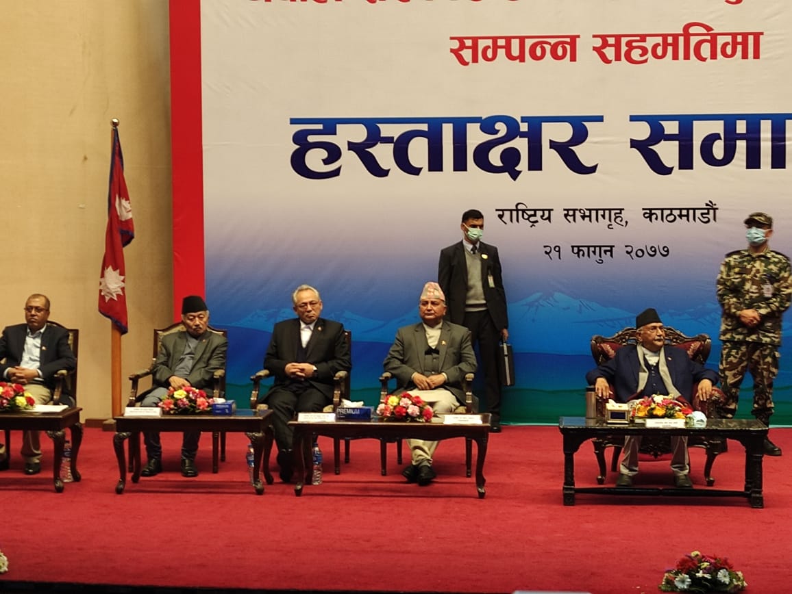 काठमाण्डौ ।प्रधानमन्त्री केपी शर्मा ओली र नेपाल कम्युनिष्ट पार्टीका महासचिव नेत्रविक्रम चन्दका उपस्थितिमा दुवै पक्षबीच भएको सहमतिमा हस्ताक्षर भएको छ ।