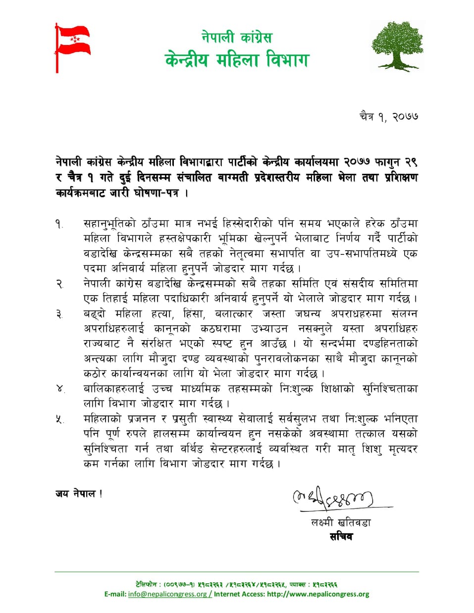 कांग्रेस केन्द्रीय महिला विभागले केन्द्रीय कार्यालय सानेपामा फागुन २९ र चैत १ गते आयोजना गरेको बागमती प्रदेशस्तरीय महिला भेला तथा प्रशिक्षण कार्यक्रमबाट ५ बुँदे घोषणापत्र जारी गर्दै यस्तो माग गरेको हो ।सहानुभूतिको ठाँउमा मात्र नभई हिस्सेदारीको पनि समय भएकाले हरेक ठाँउमा महिला विभागले हस्तक्षेपकारी भूमिका खेल्नुपर्ने निर्णय भएको विभागकी सचिव लक्ष्मी खतिवडाले जारी गरेको विज्ञप्तिमा उल्लेख छ ।